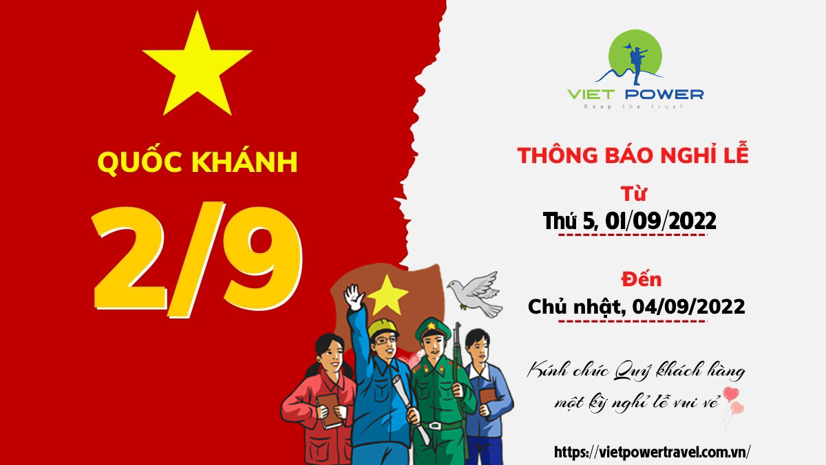 Nhân ngày lễ 2/9, công ty Du lịch Vietpower xin gửi lời chúc sức khỏe, chúc Quý khách hàng, đối tác cùng toàn thể gia đình có kỳ nghỉ lễ vui vẻ, hạnh phúc!